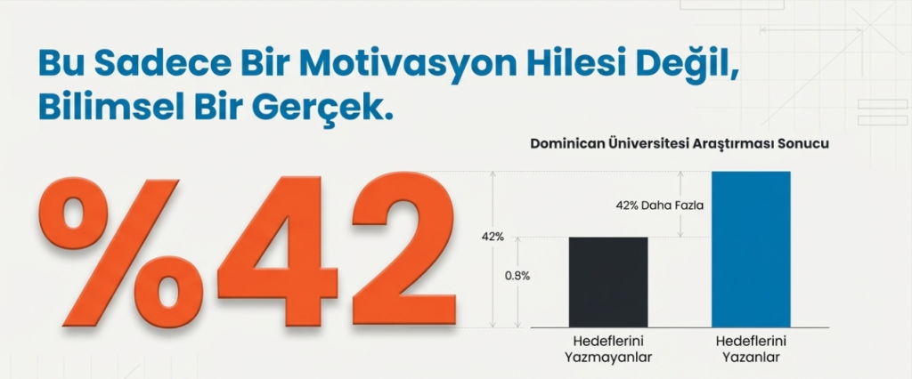 Dominik Üniversitesi’nde yapılan bir araştırma, bu iki yaklaşım arasındaki farkı net bir şekilde ortaya koydu: Hedeflerini yazmayan grubun başarı ortalamasına kıyasla, hedeflerini yazan grubun başarı oranı %42 daha yüksekti. Bu istatistik, klavye veya kaleme alınacak birkaç dakikanın, başarı oranında ne denli büyük bir fark yaratabileceğinin açık bir kanıtıdır.