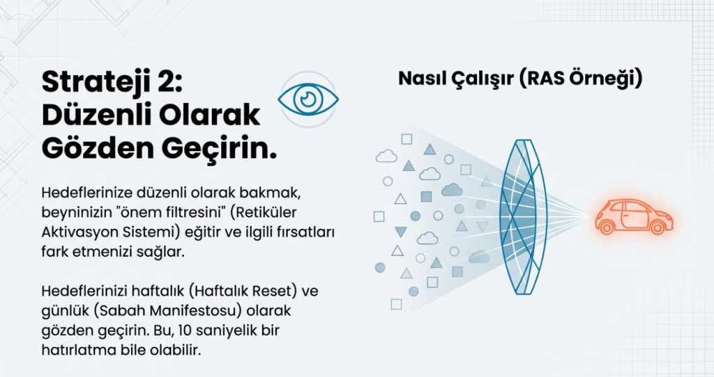 Bu güçlü mekanizmayı profesyonel hedeflerimiz için bilinçli olarak kullanabiliriz. Yazılı hedeflere her gün veya en azından her hafta düzenli olarak bakmak, RAS’ı sürekli aktif tutar. Bu sayede, hedeflerinizle ilgili fırsatları, bilgileri veya potansiyel iş birliklerini fark etme olasılığınız önemli ölçüde artar. Profesyonellerin düştüğü en yaygın hatalardan biri, hedeflerini yılın başında büyük bir hevesle belirleyip sonra bir daha asla o listeye geri dönmemeleridir.