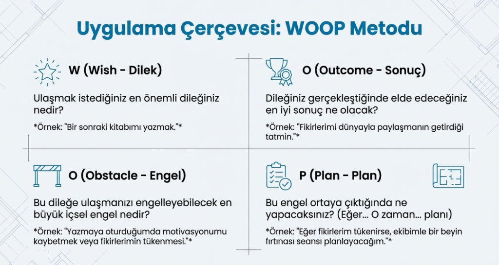 Bu noktada, psikolog Gabrielle Oettingen tarafından geliştirilen “zihinsel zıtlık” (mental contrasting) kavramına dayanan WOOP metodu devreye girer. WOOP, hedef belirleme sürecine gerçekçi bir engel analizi ve planlama adımı ekleyen basit ama güçlü bir tekniktir.