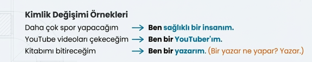 Kendi hedeflerinizi kimliğinizle nasıl ilişkilendirebileceğinizi düşünün. Aşağıdaki tablo, bu dönüşümü nasıl yapabileceğinize dair birkaç örnek sunmaktadır:
