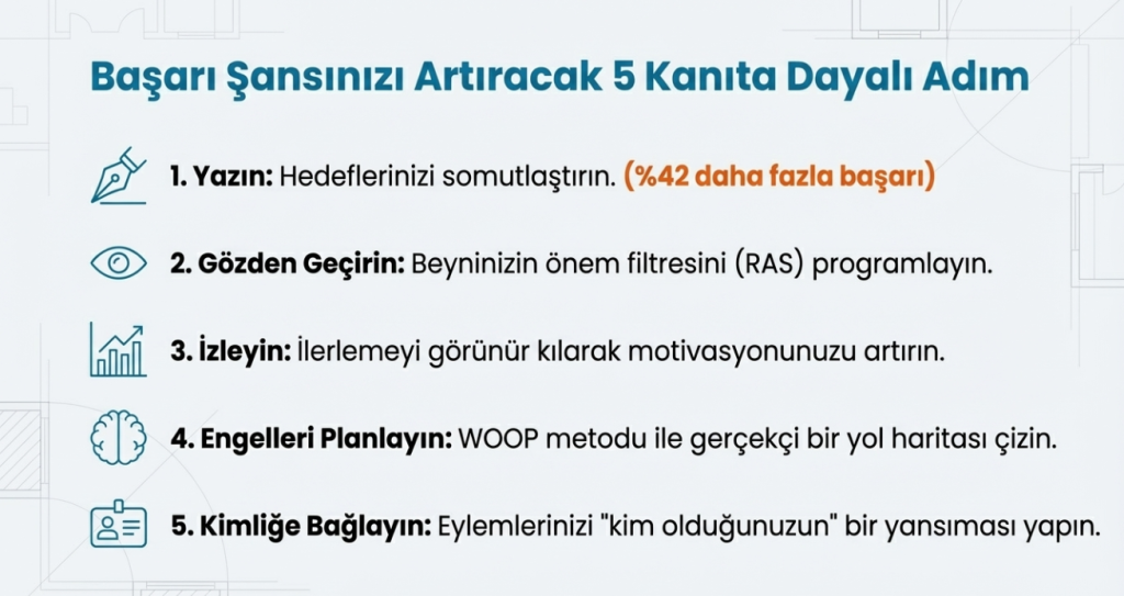 Bu rehberde, profesyonel hedeflerinize ulaşma şansınızı önemli ölçüde artıracak beş kanıta dayalı stratejiyi ele aldık:
